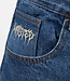 Woven label on back pocket.