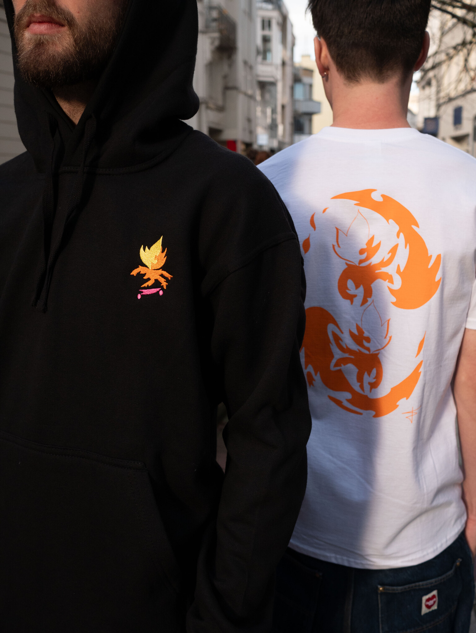 Rond het thema 'eenzaamheid' willen we vooral een gevoel van community neerzetten die dit thema overwint. Doorheen de collectie zie je verschillende 'fire figures'. Deze representeren de skaters in onze community.